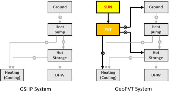 The performance of the Geo-PVT system was compared with the conventional GSHP system. Figure 15 shows the conceptual design of the GSHP system and Geo-PVT system. In the Geo-PVT system, the ground source is the main heat-source for the base load. On the other hand, the GSHP which consists of a GHE, a heat pump, and a HST operates for all the heat production in building. The individual system (ground-heat exchanger, heat pump, and circulation pumps) capacity and the operating conditions of the GSHP were set to be the same as those of the Geo-PVT system.