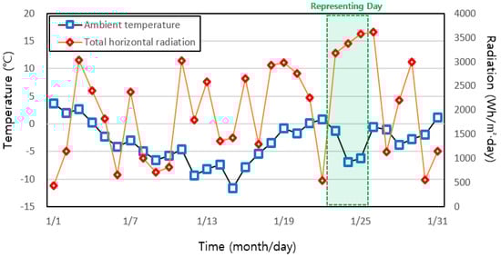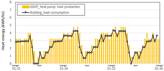 The advantage of the hybrid system can be confirmed through the calculated system-performance factor. Prior to examining the monthly system performance during the heating and cooling period, the representative day was selected to examine the operation conditions based on quantitative figures with hourly thermal energy supply and energy consumption. The representative days chosen were 3 days when the heating load was the highest from 23 to 25 January, as shown in Figure 16.