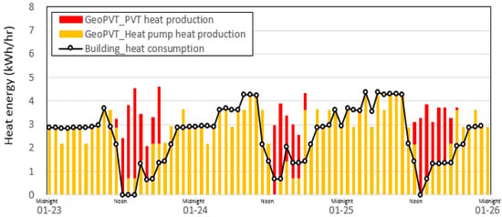 Figure 17 and Figure 18 show the hourly thermal energy supplied from the GSHP and Geo-PVT system of the representative day. The GSHP system supplied a total of 214 kWh of thermal energy to the building by operating the heat pump for 3 days. On the other hand, the Geo-PVT system supplied 192 kWh of thermal energy by working the heat pump, and produced 44 kWh of solar heat with the PVT system. The operation time of the heat pump could be reduced by using the solar heat source. The total heat pump operation time of the hybrid system for 3 days was 25 h and 30 min, which was about 12% lower than that of the GSHP system (28 h and 45 min).