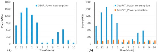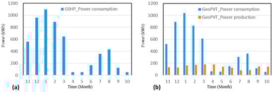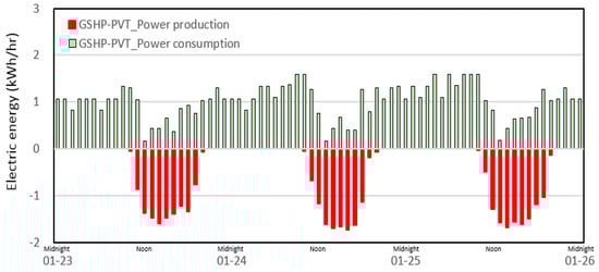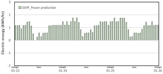 Figure 19 and Figure 20 show the power production and consumption of two systems on the representative days. The Geo-PVT system reduced the power consumption by about 6.5% compared to the existing system by reducing the operation time of the heat pump. The three-day power consumption of the GSHP system was 78 kWh and 73 kWh in the hybrid system. Plus, the hybrid system produced electric power of 35 kWh for 3 days through power generation of the PVT system.