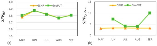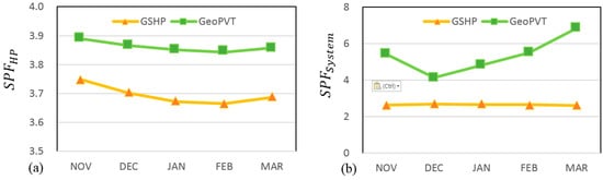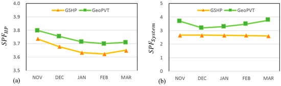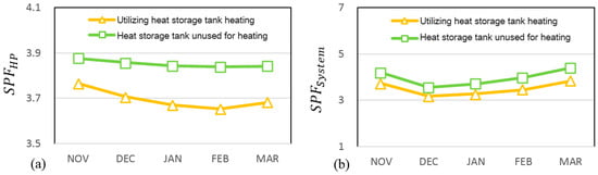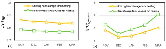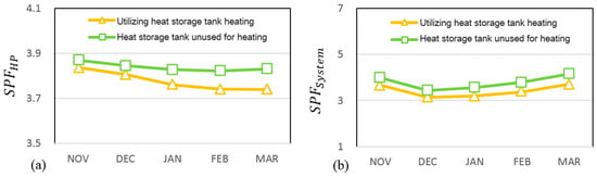 The result of SPF during night time operation in heating season. (a) Heat pump; (b) system.