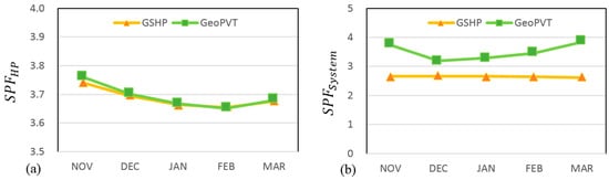 Figure 21, Figure 22 and Figure 23 show the seasonal-performance factors of the GSHP and Geo-PVT system in each heating-operation time, respectively. During the entire calculation period, the performance of the Geo-PVT system was higher than that of the GSHP system. The SPFHP of the Geo-PVT system increased by 4.6% for the daytime operation, 3.7% for the night-time operation, and 1.9% for the 24-h operation. It was figured out that the performance of the heat pump increased as the hybrid system utilized the solar heat source instead of the heat-storage mode decreased in the daytime operation. The SPFHP values were 3.84 for the heating operation and 3.69 for the heat-storage operation, respectively.