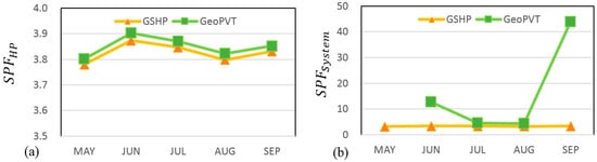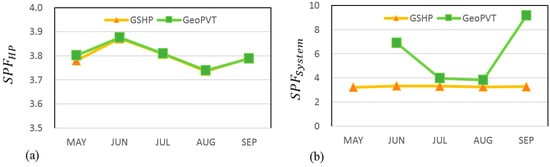 Figure 24, Figure 25 and Figure 26 represent the performance factors of GSHP and Geo-PVT systems from May to September, respectively. In cooling operation, the average SPFHP was 3.82 in both the systems. The differences between the SPFHP of the two systems were minor because of sole operation of heat pump for cooling operation. On the other hand, the SPF of total system in cooling season was observed to be high due to solar heat and electric power production of PVT system.
