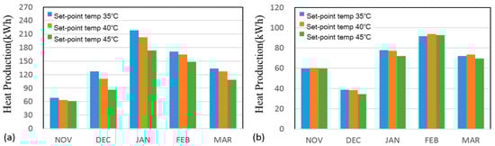 Figure 31 presents the heat production for the heating and heat-storage according to the set temperature using solar heat during the heating process is considered. The PVT-heat production is the lowest in December and the highest in January and February. It was found that the heat production of the PVT module was influenced by the heating load and the solar radiation. When the set temperature was 35 °C, the case achieved a heat production of 718 kWh for the heating during the simulation period, which was higher than those of the case with 40 °C (668 kWh) and the case with 45 °C (577 kWh) cases. The amount of heat stored in the heat storage tank reached 340 kWh and 342 kWh when the set temperature was 35 °C and 40 °C, respectively. As the set temperature increases, the heat production for heat storage decreased.
