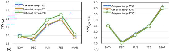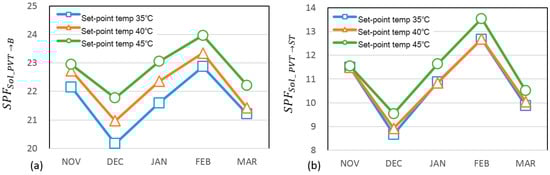 The SPF of PVT according to the set-point temperature of PVT. (a) For building heating; (b) for heat storage.