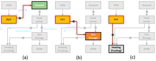 In operation (a), it provides heat from PVT to underground heat storage without heating and hot water. In operation (b), heat from PVT is not used in heating, but hot water. In addition, operation (c) provides the produced heat from PVT module to only space heating.