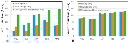 Figure 35a shows the heat production according to the connection method between the PVT and GSHP systems. The heat production was the highest in the underground heat storage at 949.29 kWh, and it was lowest in the heat storage at 437.50 kWh. In the solar-heating case, the heat production depended on the change of the heating load. The underground heat storage was influenced by solar radiation.