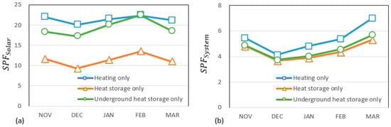 The electricity production is shown in Figure 35b. The electric power production was large in the condition of high heat production, and it was 629.93 kWh in the underground heat storage operation and 608.10 kWh in the heat storage tank heat storage operation. The figure shows the SPF of the PVT module according to the variety of solar-heat-usage methods. The SPFSolar values of the method when using solar heat were 21.41, 11.33, and 19.32 when only heating, heat storage, and underground heat storage, respectively. Figure 36 shows the SPFSystem according to the method of using solar heat. The SPFSystem of the solar-heating case was 5.35 higher than those of the other cases because solar energy was used as the direct energy and the supply temperatures, which were calculated as 4.42 in the heat-storage case and 4.58 in the underground heat-storage case.