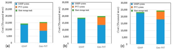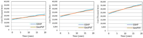 In this study, in order to develop Geo-PVT system, feasibility study was evaluated, and the result was compared with the GSHP system. In addition, the present work illustrates optimal design by return on investment (ROI) analysis according to floor areas of building model, which were 99 m2, 165 m2, and 231 m2. The capacity of ground source heat pump system was calculated as 10 kW for 99 m2, 13.5 kW for 165 m2 and 17 kW for 231 m2 building areas, respectively. Figure 37 represents the initial costs of Geo-PVT system and GSHP system.