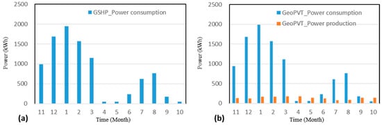 As the building area increases, the design capacity of the GSHP system was set as 3RT (10.5 kW), 4RT (14 kW) and 5RT (17.5 kW) based on the heating and cooling loads of the housing model. In Geo-PVT systems for each total capacity, the GSHP systems were designed as 7 kW, 10 kW and 13.5 kW including a 20 m2 PVT system. Figure 38, Figure 39 and Figure 40 show the power consumption and production through building heating and cooling operations in Seoul.