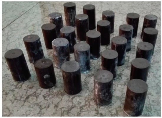 Briquette is an ideal substitute for raw coal for loading experiments []; therefore, this paper used briquette to conduct the experiment and samples were made of coal from Liangbei coal mine. Based on the study of Tian [] and Ji [], when the diameter of coal particles is between 0.015 mm and 0.5 mm, the mechanical properties of briquette are great, so the #40 mesh sieve (0.45 mm) was used to filter the coal powder for the experiment. The mass of coal, binder and water was selected by rule of thumb, and the pressure and time of making briquette were decided based on the study of Yu [] and Hu []. The room temperature whilst working was between 14 °C and 16 °C. The subtle temperature change does not affect the properties of briquette, thus this temperature change is not considered. The steps are shown as follows. Pulverized coal particles passed through a #40 mesh sieve were used. The 220 g pulverized coal, 72 g binder and 43 g pure water were weighed and evenly mixed together. The mixture was put into the Φ 50 mm × 100 mm hole, which is in the mold. The molding pressure was 100 MPa and the compression time was 10 h. Under the abovementioned conditions, the briquettes were made. To avoid the effect of rough surface on the experiment, we used sandpaper to polish the upper and lower surfaces until they were smooth. The samples were placed in the oven until the quality was unchanged. After that, those briquettes were placed into a container. And the samples are shown as Figure 1.