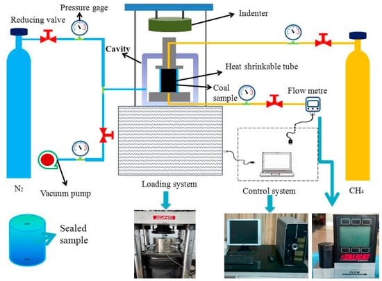 - The cavity was filled with 1.0 MPa N2, and when the confining pressure was stable, the heat-shrinkable tube was filled with 0.5 MPa methane gas. When it was steady and had remained stable for 12 h, the experiment under different loading rates (50 N/s, 100 N/s and 200 N/s) was conducted, and the data recorded.