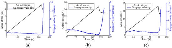 The axial stress-time-seepage curve at different loading rates: (a) the curve of stress-time-seepage under 50 N/s loading rate; (b) the curve of stress-time-seepage under 100 N/s loading rate and (c) the curve of stress-time-seepage under 200 N/s.