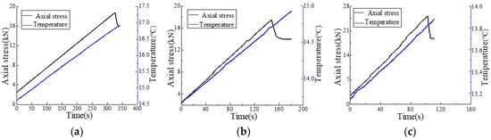 The axial stress and temperature in the same time curve: (a) the curve of stress-temperature-time under 50 N/s loading rate; (b) the curve of stress-temperature-time under 100 N/s loading rate and (c) the curve of stress-temperature-time under 200 N/s.