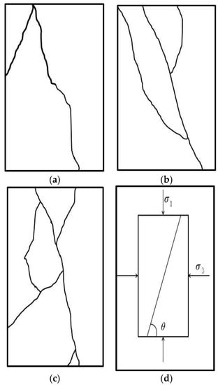The loading rates have influence on the final form of coal sample damage. Based on the actual test results, the sketch drawing of the final failure cracks is presented in Figure 5. As can be seen, under different loading rates, the final damage forms all have a larger fracture angle and the failure mode is dominated by longitudinal tensile failure. The failure surface runs through samples. However, depending on the loading rate, a difference exists in the number and form of the cracks. When the loading rate is 50 N/s, there are two cracks, one of which runs through the sample and the other ends at the side of the sample. At 100 N/s, three cracks are generated at different positions at the top of samples. Secondary cracks merge with the main crack and form the final crack. When the loading rate is 200 N/s, the number of cracks is the highest. Secondary cracks are generated at the top of the sample and form the main crack. Two secondary cracks generated from the main crack finally converge and end at the side of the sample because of shear effects and slippage. These drawings illustrate that with the increase of loading rate, the number of cracks and rupture blocks are relatively more [], and ‘the outburst tendency’ is more obvious. The number of cracks that run through the samples is increased, and the direction of the cracks has a smaller angle with the main stress direction.