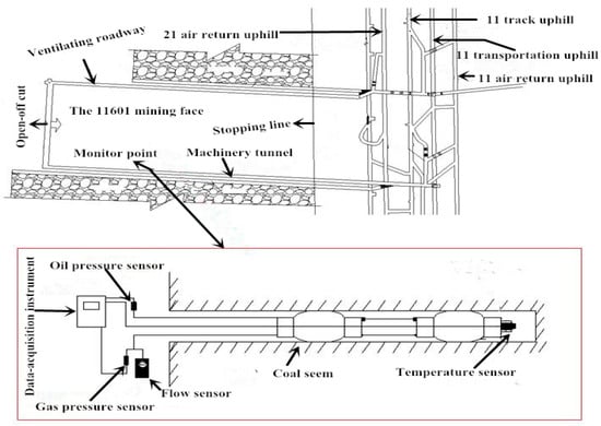The Liangbei coal mine in Henan province has experienced coal and gas outburst, so it belongs to the group of ‘outburst coal mines’. The main mining coal seam is 4.18 m in thickness and has low permeability. The 11,061 mining face was selected as the monitor site and its upper part is a coal pillar (for protecting the border) and 11,041 goaf and the lower part is 11,081 goaf. So it is an island coal face. The integrated devices for pressure, gas flow and temperature monitoring were installed in the machinery tunnel as shown in Figure 6. The pressure sensor measures the coal stress by connecting hydraulic tubing and an oil pressure capsule inserted to a borehole. The gas pressure sensor is connected to a flow sensor to measure the gas desorption pressure in the borehole. The temperature sensor measures the coal temperature in the borehole []. The monitoring results over the course of mining are shown in Figure 7 and Figure 8.
