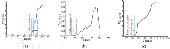 From Figure 9, it can be seen that the variation of variance is basically the same in each case. At the beginning, the variance was near zero and undergoes no significant change. Then, it starts a constant increase. This phenomenon is consistent with the study of using variance as the precursor information [,]. When the loading rate is 50 N/s, 100 N/s and 200 N/s, the time for seepage velocity to reach a minimum is 325 s, 149 s, 98 s, respectively. By using the variance to deal with the seepage velocity, the precursor time becomes 321 s, 147 s and 93 s, and the time is advanced 4 s, 2 s, and 5 s, respectively. The advanced time ratios are 1.3%, 1.3% and 5.1%. It can be seen that with the increase of loading rate, the advance time ratio of variance increases gradually, from 1.3% at 50 N/s to 501% at 200 N/s, and the time of variance increasing occurred before reaching the samples’ maximum carrying capacity.