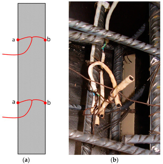 (a) Location of the surface temperature sensors on the panel; (b) detail of a surface temperature sensor before concrete casting.