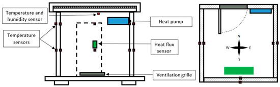 The sensors installed in each cubicle are listed herein: embedded temperature sensors, indoor temperature and humidity sensors, and a heat flux sensor in the south panel. The south panel serves as the reference panel, since it is the one with the biggest surface temperature range because it has the longest exposure to direct sunlight. To maintain the indoor temperature level, a heat pump is installed in each cubicle, which may supply heat to or release heat from the room.