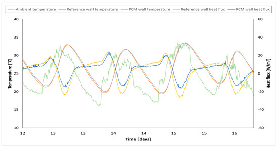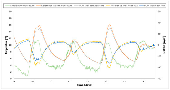 The data collected by the system are analysed in order to confirm that the results agree with the real properties of the PCM. The data should show that the wall with the PCM has a lower temperature range and a lower heat flux than the one without the PCM because this material absorbs energy by changing its phase, inhibiting the rising temperature; therefore, the temperature range is lower [8,9,14,15]. As a result, the addition of the building material increases the wall’s thermal inertia [11,16,17,18,19,20]. The acquisition system should be accurate enough to detect this behaviour; otherwise, it would not be suitable for this application.