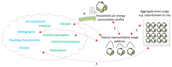 Figure 1 shows a conceptual diagram of the problem. As discussed in a recent review of residential energy consumption behaviours [15], an individual household’s energy and a/c consumption profile is likely the result of many confounding factors. Some of these, for example demographics, climate or building characteristics, are readily measurable and quantifiable and statistical information at the collective level is often available. Others—such as individual priorities, lifestyles, or motivations—are difficult to formalize and measure, profoundly inter-related, and are likely to be evolving over time and/or changing in response to particular events. The contribution of individual behaviours to overall household a/c usage further confounds the problem. The constantly changing, evolving nature of human behaviour in response to a multitude of factors defies simplistic explanation, and certainly no air-conditioner behavioural model could be found in the literature that seeks to understand the why of occupant behaviour as opposed to the how at a stationary moment in time.