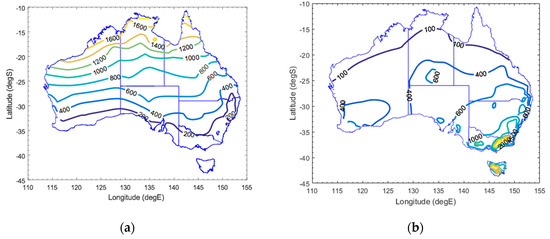 (a) Contours of cooling degree days and (b) heating degree days across Australia based on apparent temperature as calculated using 2011 Bureau of Meteorology (BOM) weather station measurements.