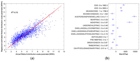 Regression analysis was performed to estimate the two Weibull energy distribution parameters, the scale parameter (similar to the mean) and the shape parameter (an indicator of spread), for each SA2 region using the climate, building and demographic variables as predictors. A step-wise least squares regression was performed, allowing for first-order interactions between the predictors. Plots of the regression estimated Weibull distribution scale and shape parameters versus the fitted values are shown in Figure 3. Also shown are plots of the relative main effects (the influence of a given predictor while accounting for all other variables) for those parameters identified as significant for the two regressions.