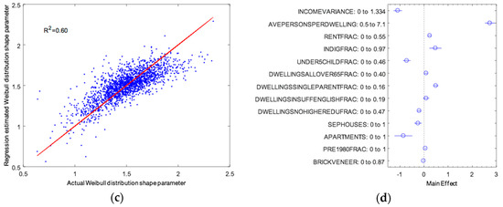 (a,c) Regression fits of Weibull distribution scale parameter and shape parameter for distributions of annual energy consumption for Statistical Area Level 2 (SA2) regions across Australia; (b,d) Comparison of relative main effects sizes of significant regression predictors in the fitted models for scale parameter and shape parameter.