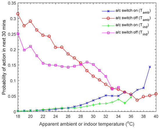 Probability of air-conditioner (a/c) “switch on” action and “switch off” actions as a function of apparent ambient and apparent indoor temperatures for days.