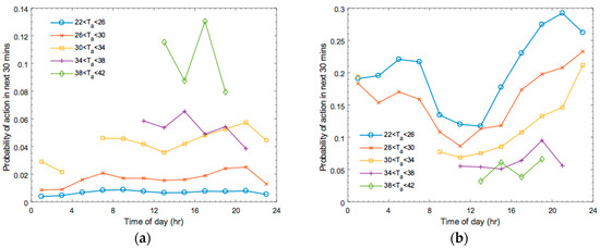 Probability of air-conditioner “switch on” action (a) and “switch off” action (b) as a function of time of day separated by apparent ambient temperature (Tapp).