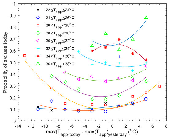 Probability of a/c usage on the given day versus the difference between the given days maximum apparent ambient temperature (Tapp), and the maximum apparent temperature on the preceding day for different values of today’s maximum apparent temperature.