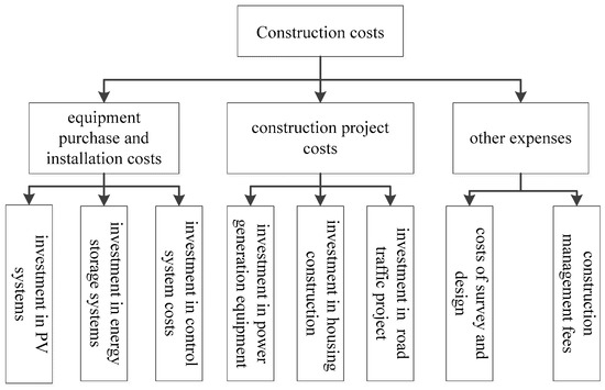 Construction costs include equipment purchase, installation costs, construction project costs and other expenses. The equipment purchase and installation costs comprise investments in the PV systems, i.e., energy storage systems and control systems. The construction project costs include the cost of the power generation equipment, housing construction, and road traffic projects. Other expenses include the costs of surveying and designing, and construction management fees. The construction costs are shown in Figure 1.