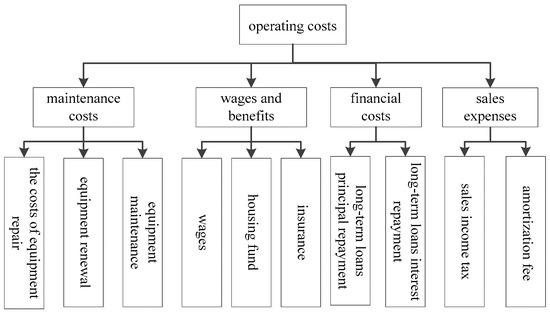The power generation of PV-BESS power plants primarily depends on sunlight, so its operating costs primarily include maintenance costs, wages and benefits, financial costs and sales expenses. Maintenance costs include the costs of equipment repair, equipment renewal, and equipment maintenance. Wages and benefits include wages, housing funding and insurance. The financial expenses are the principal repayment and interest repayment of long-term loans. The sales expenses are primarily sales income tax and amortization fees. The operating costs are shown in Figure 2.
