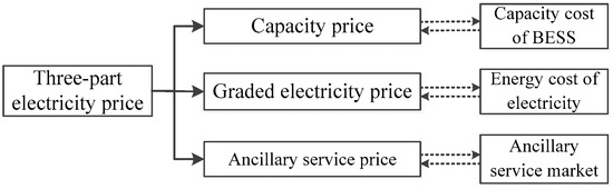 Through the analysis of the construction and operation costs of the PV-BESS power plants, the cost of power generation can be divided into two parts: the capacity cost of BESS and the energy cost of electricity. Between these, the capacity cost of BESS is primarily composed of the investment cost of BESS, while the energy cost of electricity is primarily composed of the investment cost of the PV power generation system and the operation cost of the whole PV-BESS power plant. To recover the cost of power generation and ensure a reasonable economic return and to take full advantage of the BESS in improving the power quality and reliability of PV power generation, a three-part electricity price mechanism is proposed in this paper. The three parts are the capacity price, graded electricity price and ancillary service price.