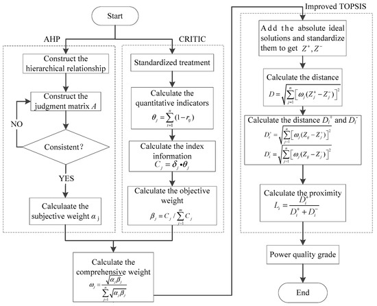 The particular process of the power quality evaluation method based on the AHP-CRITIC and improved TOPSIS proposed in this paper is shown in Figure 4.