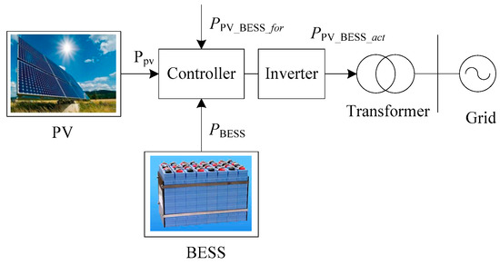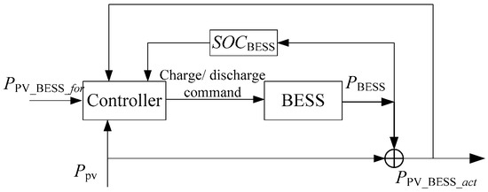 The pure PV power plant with an energy storage system can stabilize the output power fluctuation of the PV system and reduce the deviation between the actual and the short-term forecasted power by the rapid adjustment of the energy storage system. If there is electricity that is supposed to be abandoned while the PV power curve is optimized, the electricity can be stored by the BESS for the auxiliary service. The process of optimizing the PV power curve with the BESS is simulated. By analysing the charging and discharging power curve of the BESS and its state of charge (SOC), the electricity stored by the BESS can be calculated. The system structure diagram of the PV-BESS power plant and schematic diagram of simulation are shown in Figure 5 and Figure 6.