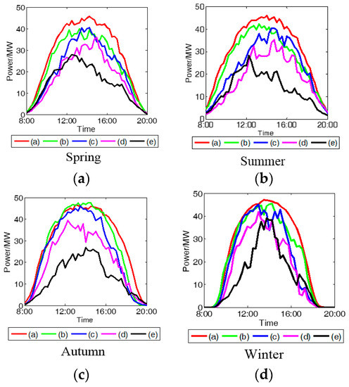 The output of the PV-BESS power plant is analyzed according to the four different seasons: spring, summer, autumn and winter, and the PV output of each season are divided into 5 types of typical days (a)–(e), as shown in Figure 7.