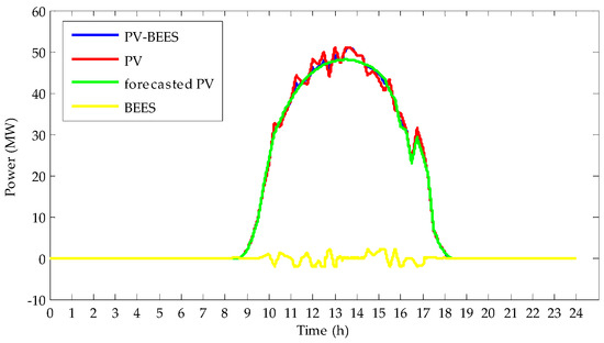 - The power balance constraint of the whole systemwhere PPV is the power of PV system (MW) and PBESS is the power of the BESS (MW).