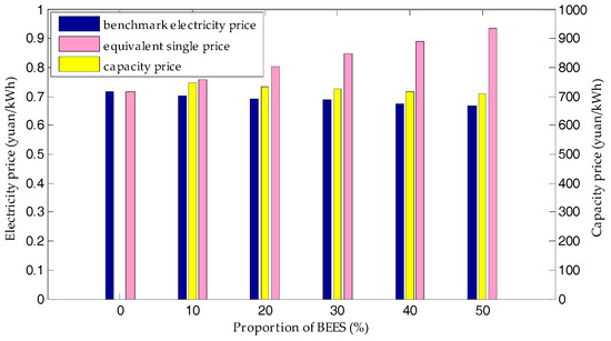 Figure 10 indicates that in the price aspect, with the increase of the capacity of the energy storage system, the equivalent single electricity price gradually increased, while the capacity price and benchmark electricity price gradually decreased. Figure 11 indicates that with the increase of the energy storage capacity, the investment cost gradually increased. To ensure the benchmark internal rate of return (8%) of the industry, the annual total electricity income increased gradually. The average annual capacity charge increased gradually, while the average annual benchmark electricity charge gradually decreased. The different trends in price and charge were caused by the relationship between the electricity charge, on-grid electricity and the electricity price.