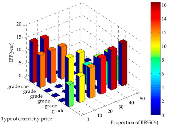 When the PV-BESS power plant is placed into operation, it will be involved in the assessment of the power grid dispatch centre, and the graded electricity price will be implemented. Based on the results in Table 7, the rewards or punishments of assessment of the PV plant with different capacities of energy storage systems is first calculated according to the adjustment coefficient of the benchmark electricity price and the coefficient of rewards or punishment. Then, the ancillary service income is calculated according to the simulation results. Next, the graded electricity price and electricity charge of the different levels of the grid connected power quality are calculated. Finally, the total economic income and expected internal rate of return (IRR) and investment payoff period (IPP) are calculated and compared with those of the current PV benchmark electricity price. The results are shown in Table 10, Figure 12 and Figure 13.