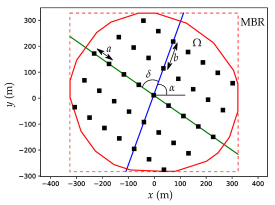 Given the minimum bounding rectangle (MBR) containing the area of deployment , the WEC array is generated by placing a WEC at the southwestern corner of that rectangle and drawing rows and columns until the number of WECs in remains unchanged; that is, until is fully filled by WECs. The total number of WECs, N, is thereby determined by , a, b, and .