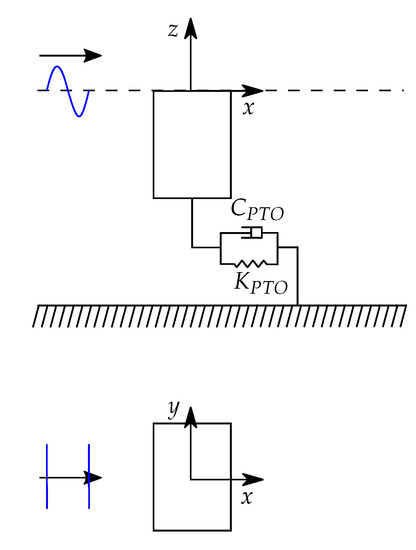 where the vector contains the complex amplitude for every mode of motion in the array (), M is the mass matrix, is the added mass matrix, is the radiation damping matrix, is the PTO damping matrix, is the hydrostatic stiffness matrix, is the PTO stiffness matrix, is the diffraction force vector (), is the imaginary unit, and t is time. Both and are diagonal matrices according to the separate PTO models for each mode of motion in the array; is the force due to the action of gravity, is the force due to the action of the PTO system, is the force due to the interaction between the plane wave and the WECs at rest, and is the force due to the motion of the WECs in still water.