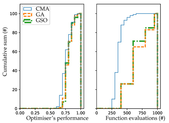 The number of evaluations of the objective function required by the optimisers prior to termination over the 100 runs are also shown in Figure 4. The better performances of the GA and the GSO can be seen to be associated with more function evaluations, when compared with the CMA. In approximately 70 out of the 100 runs, the CMA required less than 400 function evaluations before satisfying any of the termination criteria (Section 3.2), while this was the least required by the GA and the GSO before checking stagnation (Section 3.3 and Section 3.4). Both the GA and the GSO required between 400 and 800 function evaluations in approximately 85 out of the 100 runs before satisfying the stagnation condition. Thus, about 15 out of the 100 runs of the GA and the GSO were stopped because they reached the maximum allowed number of function evaluations.