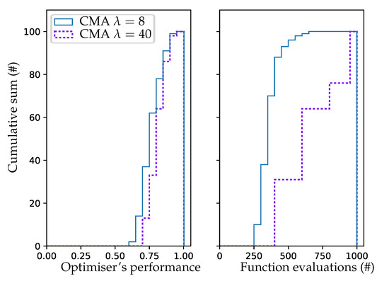 Covariance matrix adaptation evolution strategy’s (CMA’s) performance and required number of function evaluations prior to termination. The results are shown for 100 runs performed using population sizes of 8 and 40.