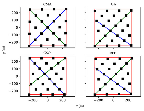 The best array layouts found by the CMA (with ), the GA and the GSO over the 100 runs, and the REF layout are shown in Figure 6. At first glance, all four layouts seem to have a similar configuration of parameters. Because of their apparent similarity, one may describe them as staggered arrays, where the two diagonals of the deployment area define rows and columns, that is, rad (or ) and rad.