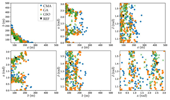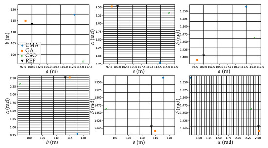 The degree of similarity between the best layout solutions (Figure 6) can be measured by the distances between them in the parameter space, by their q-factor, and by their yearly power production (Table 2). In terms of the q-factor and yearly power production, the best layout solutions are practically the same; however, they are located several grid points away from each other with respect to the search-space discretisation used to find the REF array layout (denoted by SSD). This is illustrated in Figure 7, where the best layouts and the grid lines are projected onto the six different planes of the parameter space. The large distance between the CMA’s and the REF’s solutions is due to the fact that rows in the CMA’s layout are approximately 90 out of line compared with those in the REF’s layout. This happens to be near the limiting case in which the solution and is the same as the solution and with the role of the rows and columns swapped. With regard to the GSO’s layout, this can be seen to match the GA’s and REF’s layouts when it is mirrored with respect to the y-axis. This causes the layouts to have a similar appearance while being several grid points away from each other with respect to the SSD. Overall, it seems that the best layout solutions yield from a region in the parameter space that spans beyond grid points adjacent to the REF’s solution.