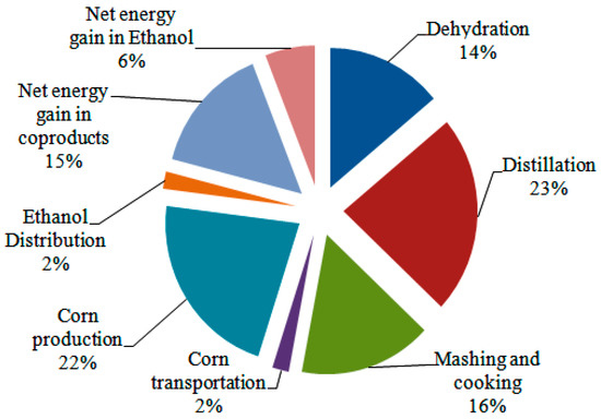 Ethanol has various benefits over gasoline to become an attractive substitute fuel. Ethanol is a renewable fuel with a high-octane number, high oxygen content, is less toxic, has a low carbon/hydrogen ratio, and the higher latent heat of vaporization of ethanol raises its volumetric efficiency [3,4]. A disadvantage of ethanol is the decreased lower heating value, which leads to an increase in fuel consumption [4]. The manufacture of anhydrous ethanol (water content that is <1%) is a costly, and an important amount of energy is needed throughout the dehydration and distillation of ethanol. Some authors have suggested that 37% of the energy manufacture of neat ethanol is connected with water dehydration and distillation (see Figure 1) [5,6]. Thus, the use of hydrous ethanol as a fuel would consequently enhance the overall energy efficiency, making it a good choice as a fuel source [3].