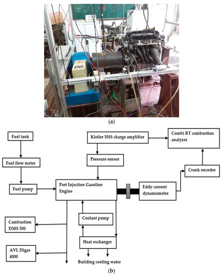 (a) The research engine; (b) schematic of the experimental setup.