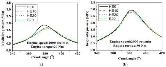Impact of hydrous ethanol gasoline blends on in-cylinder pressure at an engine speed of 2000 rev/min and engine loads of (a) 20 Nm and (b) 50 Nm.
