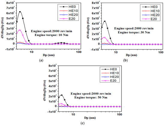 Size distribution of particles for ethanol blends at a 2000 rev/min engine speed and (a) 10 Nm; (b) 30 Nm; (c) 50 Nm engine loads.